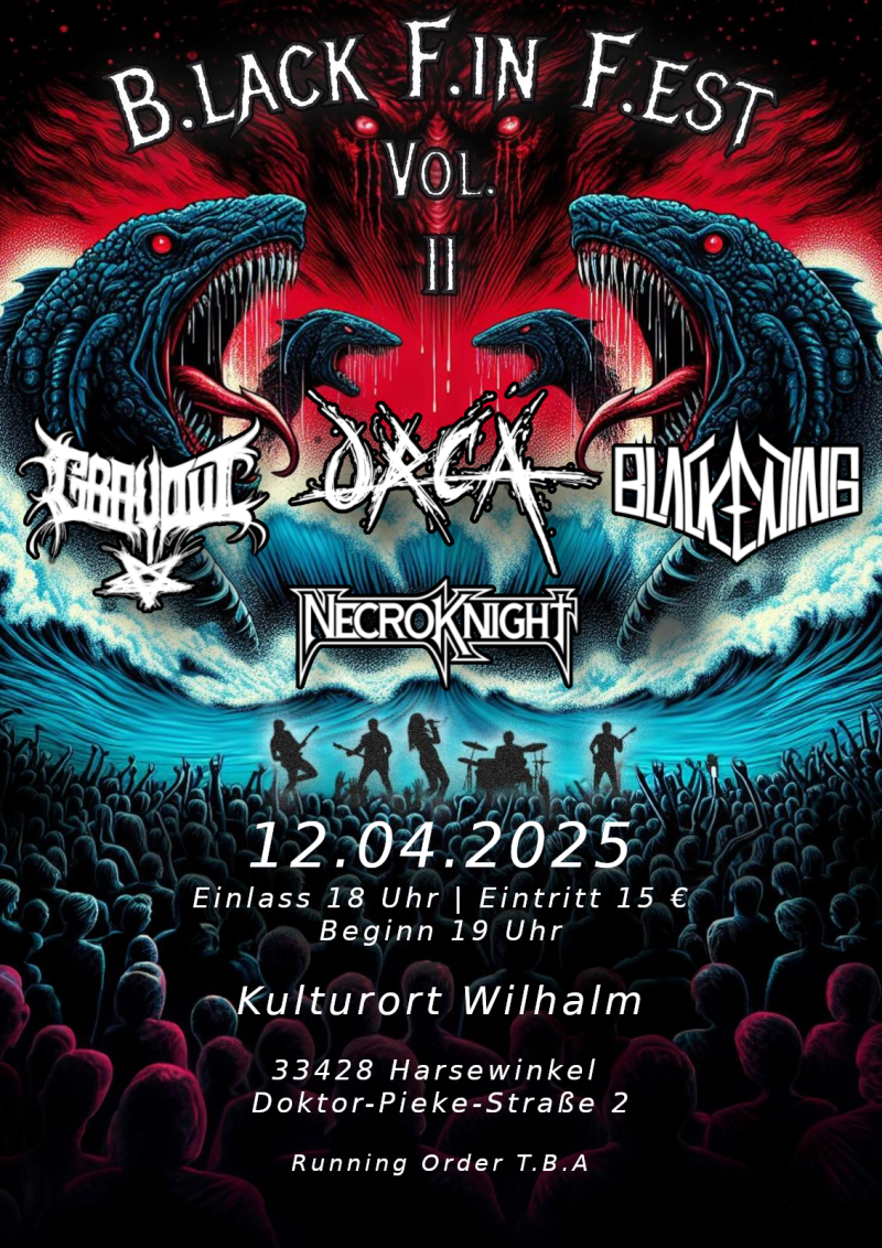 Unser erstes Konzert findet beim B.LACK F.IN F.EST VOL. II im Kulturort Wilhalm in Harsewinkel statt - zusammen mit Orca, Grayout und Necroknight. Wir freuen uns auf einen großartigen Abend mit euch und den anderen Bands!